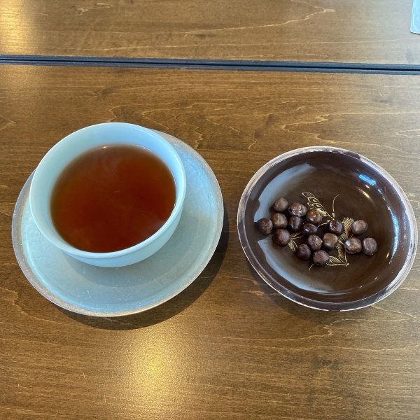 食前は、ほうじ茶と塩えんどう豆をつまんでお待ちくださいと